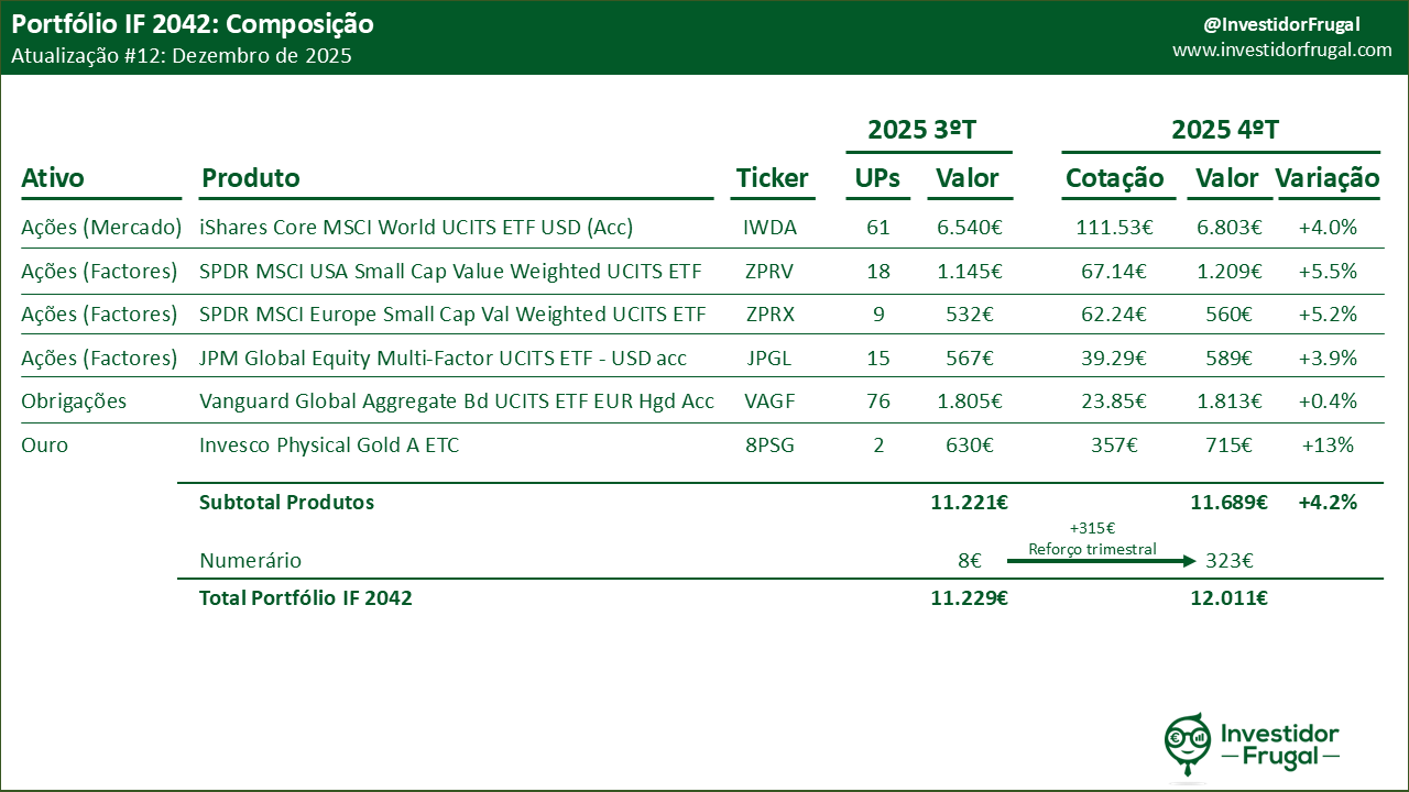 No final do 1º trimestre de 2026 voltarei com a 13ª atualização trimestral do portfólio, que irá partilhar o seu desempenho e listar os produtos a reforçar a 31 de Março de 2026. Por se tratar de um novo ano civil, e em linha com a metodologia inicialmente definida para o portfólio, a contribuição regular de 315€ será atualizada pela taxa inflação de Dezembro de 2025 a publicar pelo Banco de Portugal.