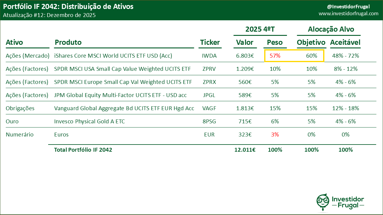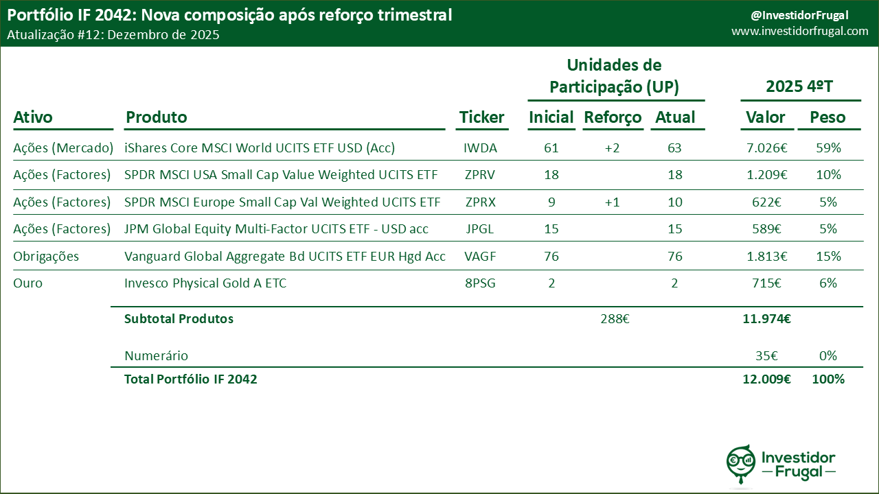 O Portfólio IF 2042 é um Portfólio com horizonte temporal de 20 anos, lançado em Dezembro de 2022, que alinha com a filosofia de investimento passivo detalhada nos meus Portfólios Modelo. O Portfólio IF 2042 foi constituído inicialmente com 5.000€ e recebe contribuições adicionais de 300€ no final de cada trimestre (ajustadas anualmente pela taxa de inflação homóloga de Dezembro). Para 2025, o reforço trimestral é de 315€, após os ajustes anuais de 1.9% e 3.1% no final dos dois anos anteriores.